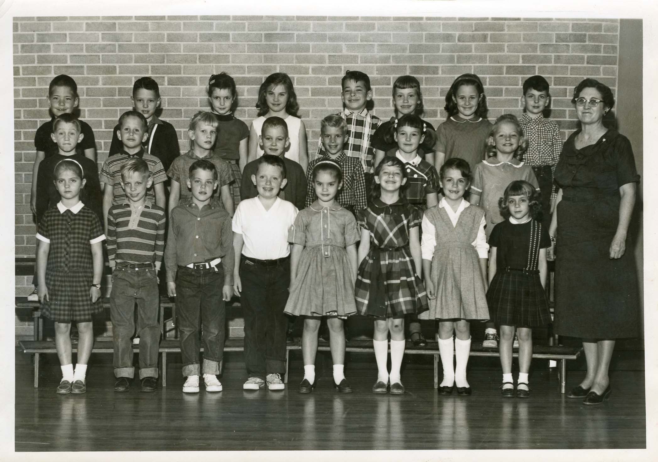 Only 23 children (11 boys and 12 girls) of the 27 children (12 boys and 15 girls) in the class are shown in the photo. Kathyrn Bowling, Lana Erickson, Judy Lindsay, and Chuck Prewitt were not present for the photo. Many thanks to Carla Blomquist for providing most of the initial identifications and to Judy Lindsay Donohue, Jim Moss, and Mary Jones for some others. Although listed in the roster for some reason, Diane Waller was actually in Mrs. McAfee's class and is therefore not in the photo. Conversely, Veronica Wright is in the photo but is not listed on the roster. The last unidentified boys in the photo are presumably Tommy Morgan and Thomas Taylor, but I don't know which.