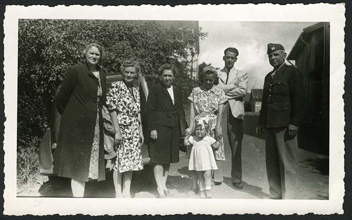 L to R: Hansine Braaten, Kirste Korlund Walheim, Esther Olsen, Gunhild Korslund Arenesen, Sidsel Arnesen (child),Kåre Arensen, Palmer Olsen (Norway, Summer 1947) Palmer and Esther Olsen (from Texas) were visiting Palmer's cousins in Norway while Palmer was stationed in Germany after World War II. |